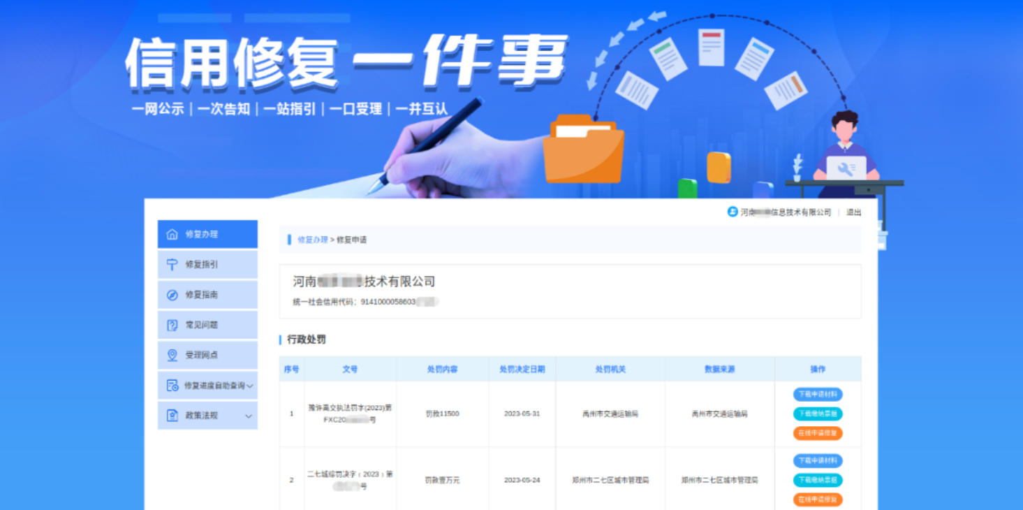 此前,河南已在交通运输领域率先推出行政处罚缴纳电子票据“一键查询下载”功能,解决了运输企业因票据遗失导致的票据开具“多地来回跑”难题。目前,企业只需登录“信用中国(河南)”网站信用修复“一件事”专区,即可一键查询、下载全省范围内企业自身行政处罚缴纳电子票据,轻松获取修复凭证,完成信用修复,通过全流程网办大幅节约时间与人力成本。